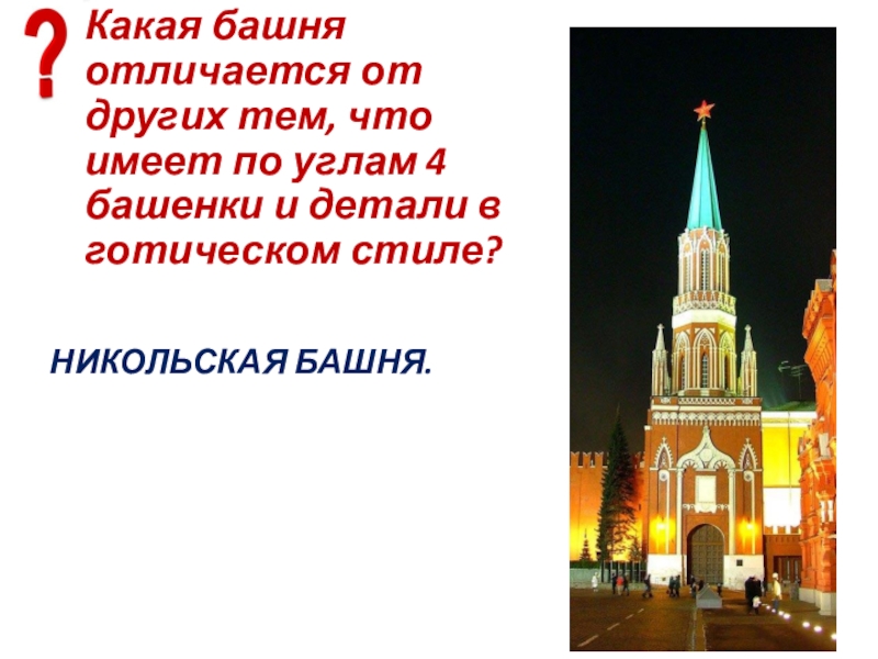 Слайд 97Какая башня отличается от других тем, что имеет по углам 4