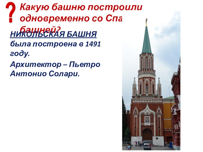 Слайд 96Какую башню построили одновременно со Спасской башней?