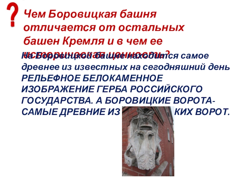 Слайд 71Чем Боровицкая башня отличается от остальных башен Кремля и в чем