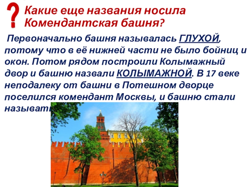 что в её нижней части не было бойниц и окон. Потом рядом построили Колымажный двор и башню назвали КОЛЫМАЖНОЙ. В 17 веке неподалеку от башни в Потешном дворце поселился комендант Москвы, и башню стали называть «КОМЕНДАНТСКАЯ»