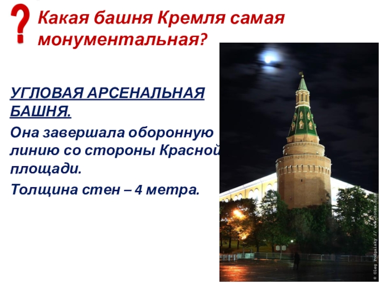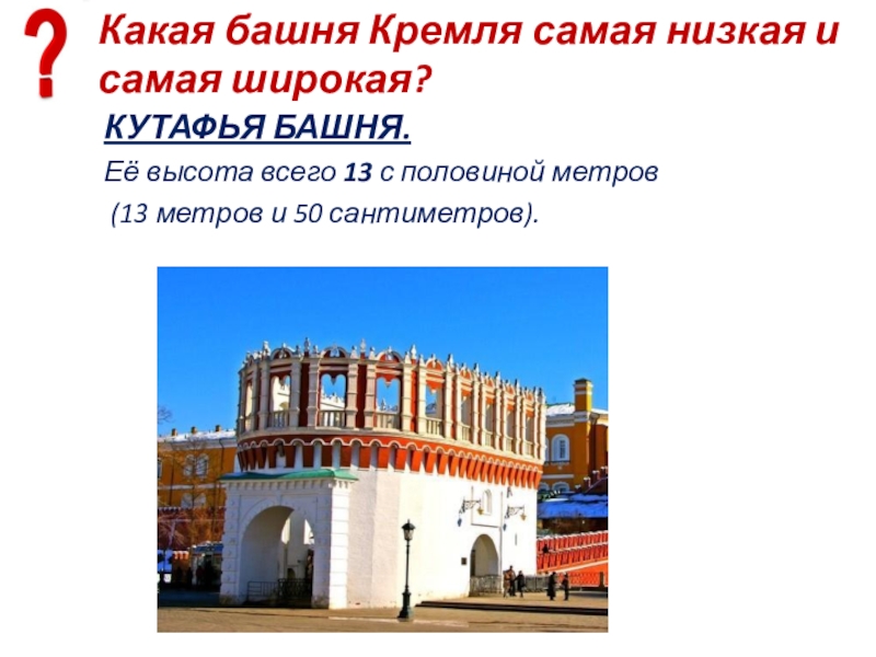 Слайд 83Какая башня Кремля самая низкая и самая широкая?