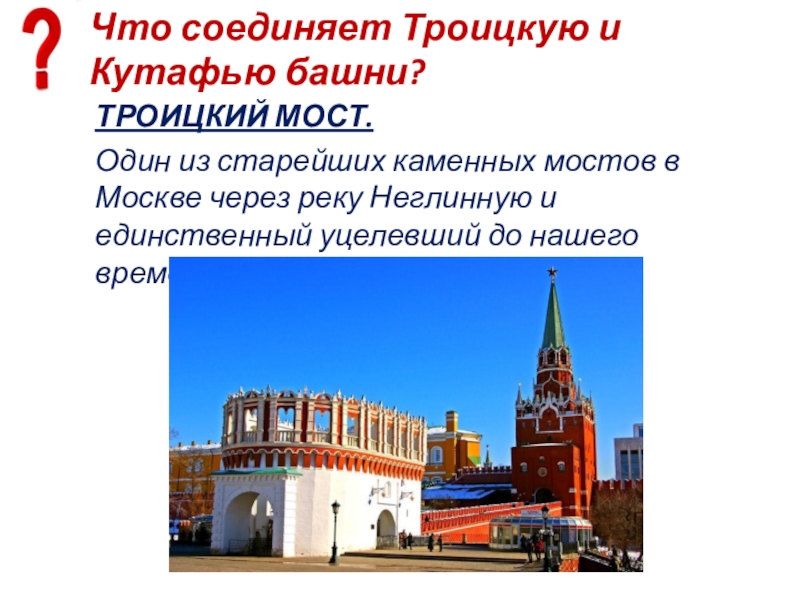 Слайд 84Что соединяет Троицкую и Кутафью башни?