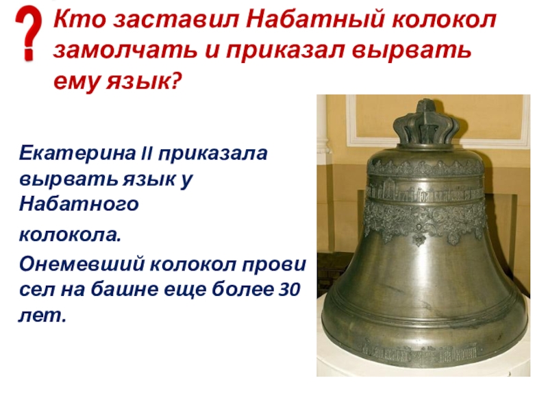 Слайд 33Кто заставил Набатный колокол замолчать и приказал вырвать ему язык?