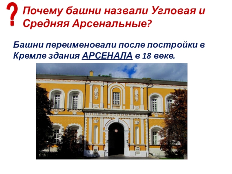 Слайд 87Почему башни назвали Угловая и Средняя Арсенальные?