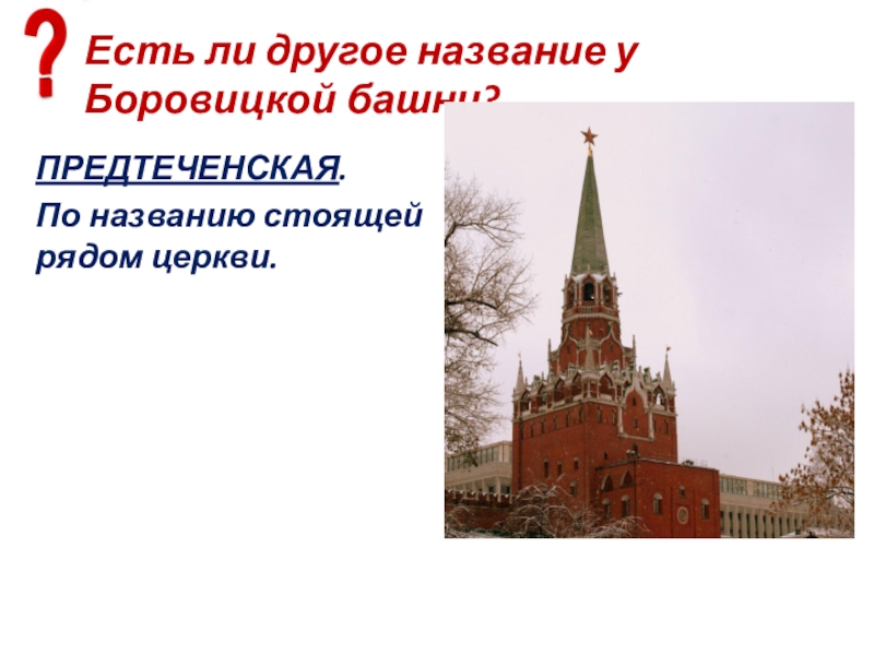 Слайд 74Есть ли другое название у Боровицкой башни?