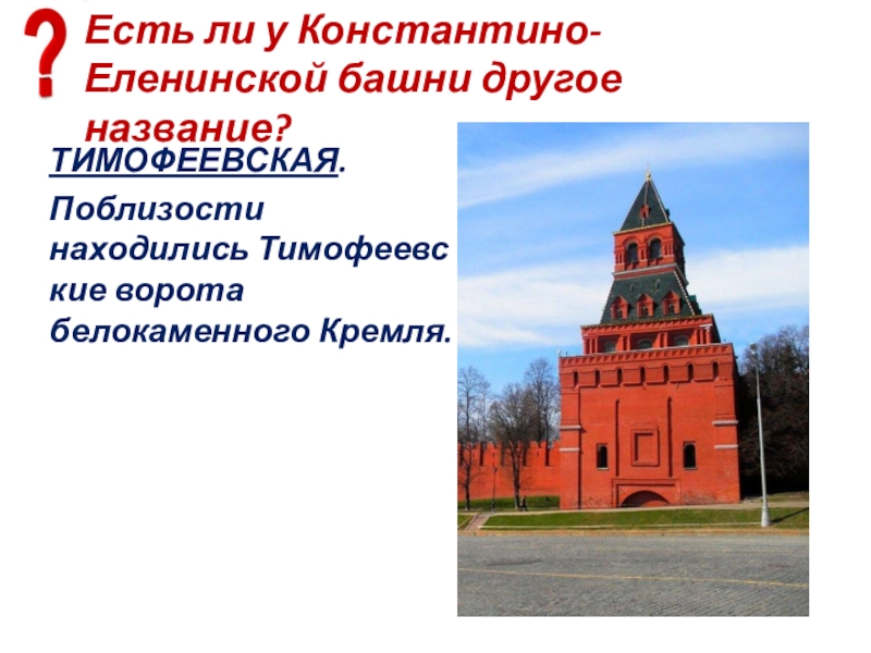 Слайд 36Есть ли у Константино-Еленинской башни другое название?