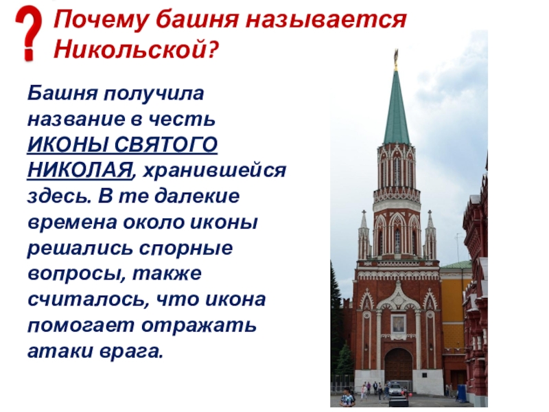 Слайд 95Почему башня называется Никольской?