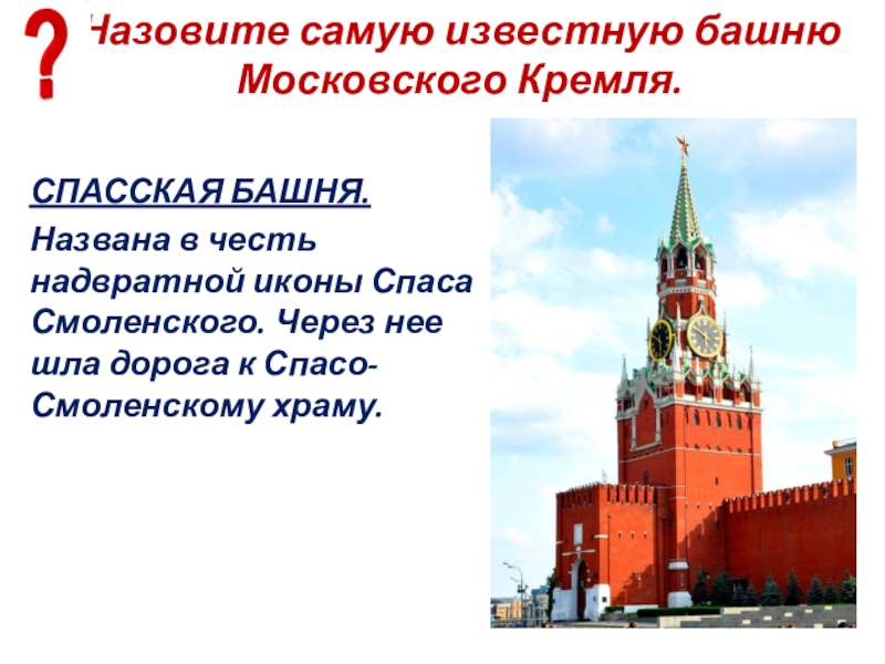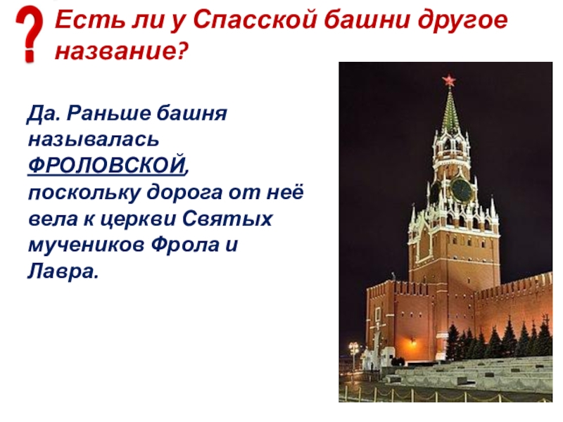 Слайд 22Есть ли у Спасской башни другое название?
