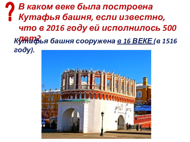 Слайд 85В каком веке была построена Кутафья башня, если известно, что в