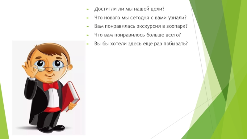 Достигли ли мы нашей цели?Что нового мы сегодня с вами узнали?Вам понравилась экскурсия в зоопарк?Что вам понравилось