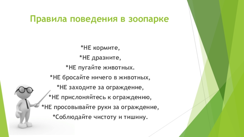 Правила поведения в зоопарке *НЕ кормите, *НЕ дразните, *НЕ пугайте животных. *НЕ бросайте ничего в животных, *НЕ