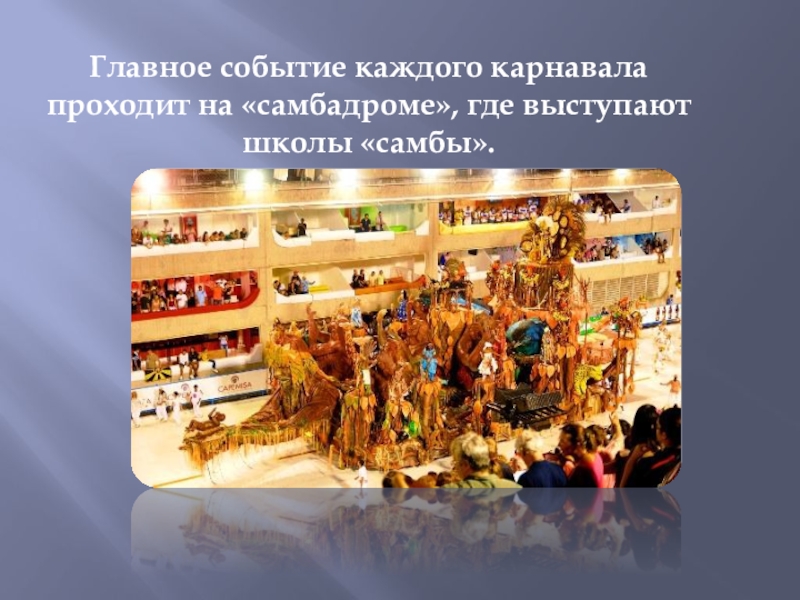 Слайд 4Главное событие каждого карнавала проходит на «самбадроме», где выступают школы «самбы».