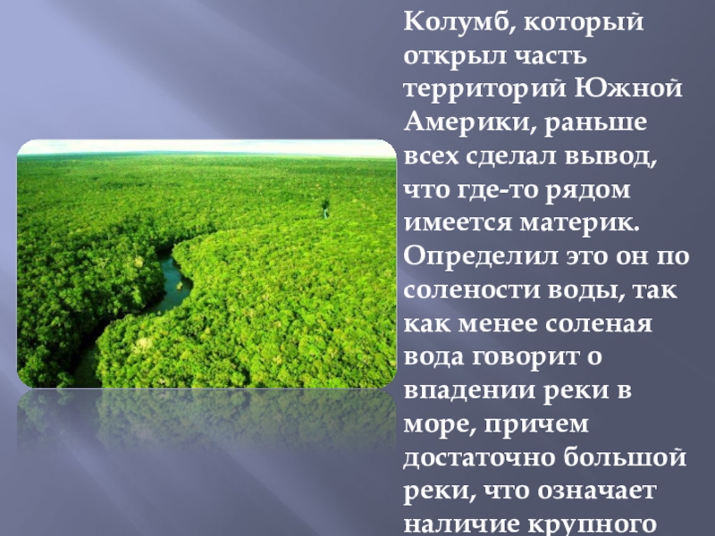 Колумб, который открыл часть территорий Южной Америки, раньше всех сделал вывод, что где-то рядом имеется материк. Определил это он по солености воды, так как менее соленая вода говорит о впадении реки в море, причем достаточно большой