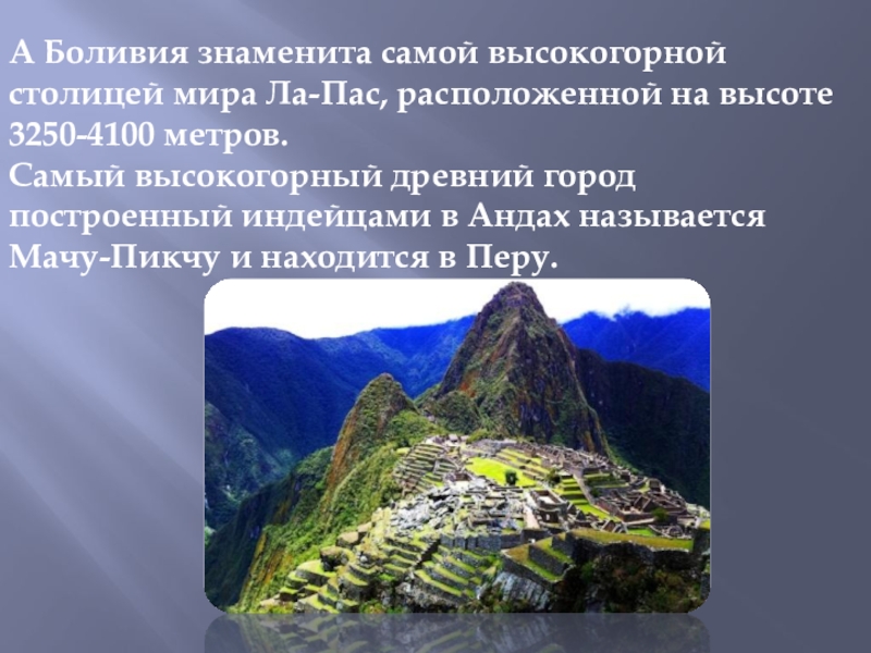 Слайд 7А Боливия знаменита самой высокогорной столицей мира Ла-Пас, расположенной на высоте