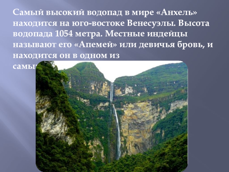 Слайд 6Самый высокий водопад в мире «Анхель» находится на юго-востоке Венесуэлы. Высота