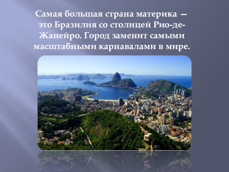 Слайд 3Самая большая страна материка — это Бразилия со столицей Рио-де-Жанейро. Город