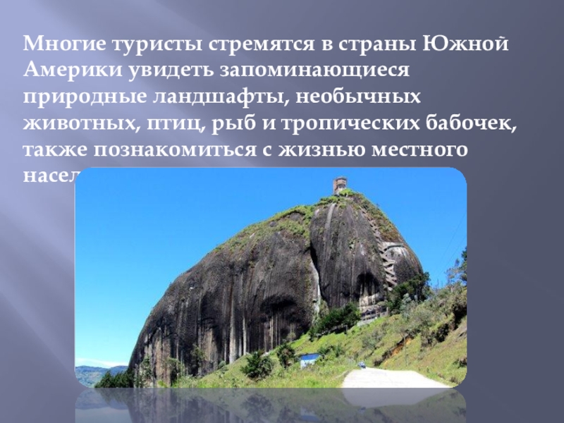 Слайд 9Многие туристы стремятся в страны Южной Америки увидеть запоминающиеся природные ландшафты,