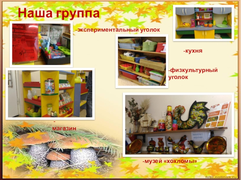 Наша группа - магазин -музей «хохломы»-физкультурный уголок-кухня -экспериментальный уголок