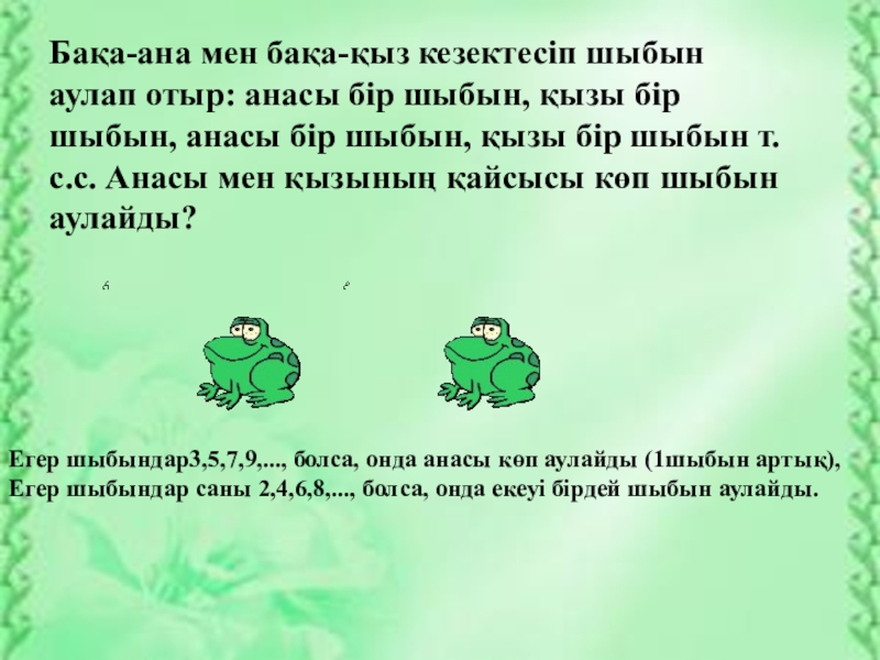 Егер шыбындар3,5,7,9,..., болса, онда анасы көп аулайды (1шыбын артық), Егер шыбындар саны 2,4,6,8,..., болса, онда екеуі бірдей шыбын аулайды.