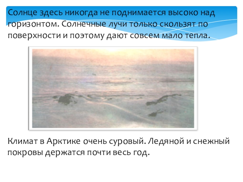 Слайд 5Климат в Арктике очень суровый. Ледяной и снежный покровы держатся почти