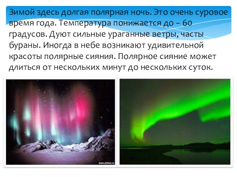 понижается до – 60 градусов. Дуют сильные ураганные ветры, часты бураны. Иногда в небе возникают удивительной красоты полярные сияния. Полярное сияние может длиться от нескольких минут до нескольких суток.
