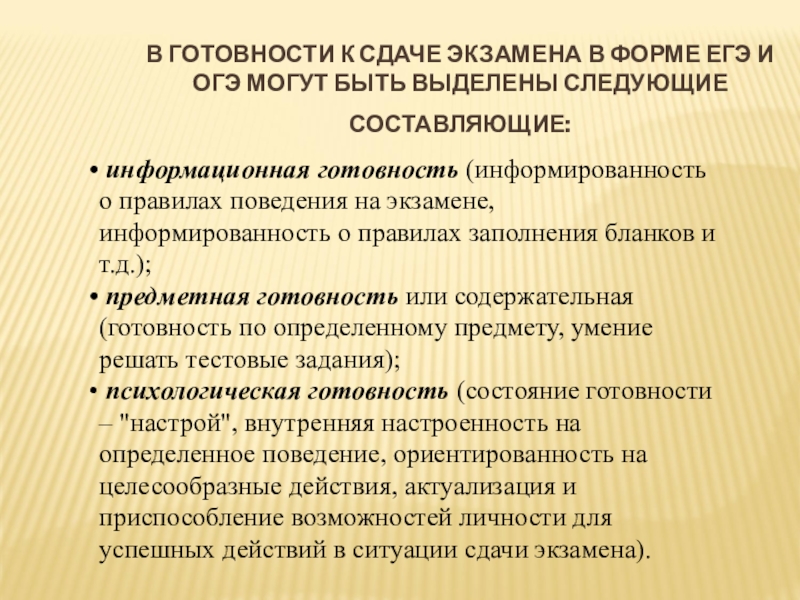 психологическая готовность (состояние готовности – "настрой", внутренняя настроенность на определенное поведение, ориентированность на целесообразные действия, актуализация и приспособление возможностей личности для успешных действий в ситуации сдачи экзамена).