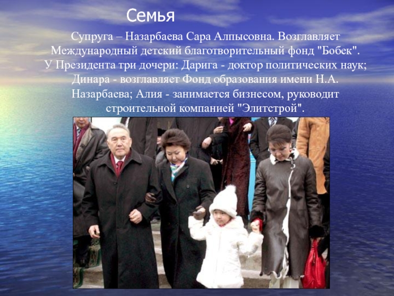 Семья Супруга – Назарбаева Сара Алпысовна. Возглавляет Международный детский благотворительный фонд