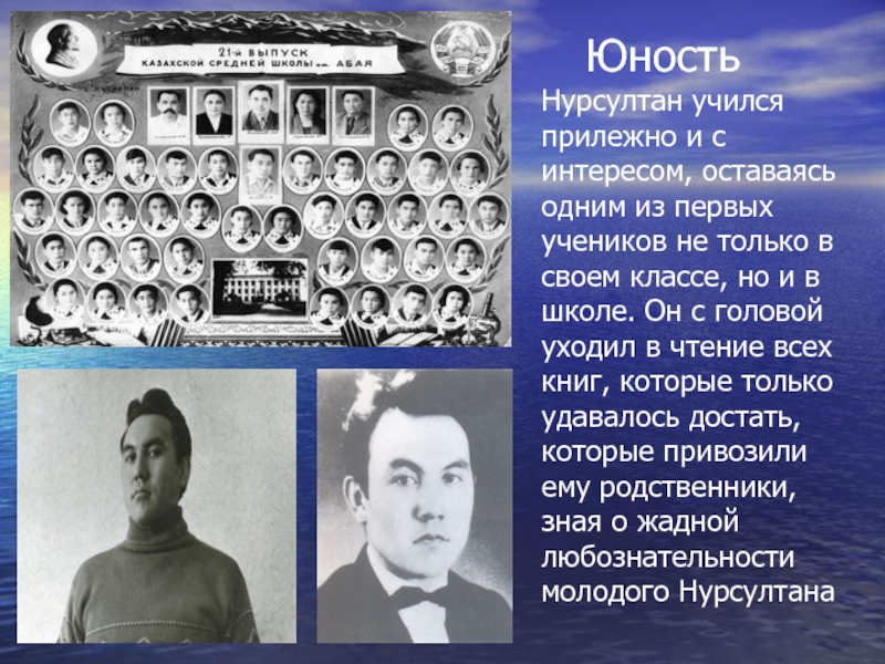 ЮностьНурсултан учился прилежно и с интересом, оставаясь одним из первых учеников не только в своем классе, но