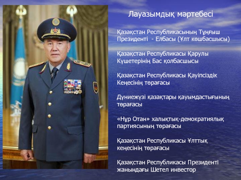 Лауазымдық мәртебесі Қазақстан Республикасының Тұңғыш Президенті - Елбасы (Ұлт көшбасшысы)Қазақстан Республикасы Қарулы Күшетерінің Бас