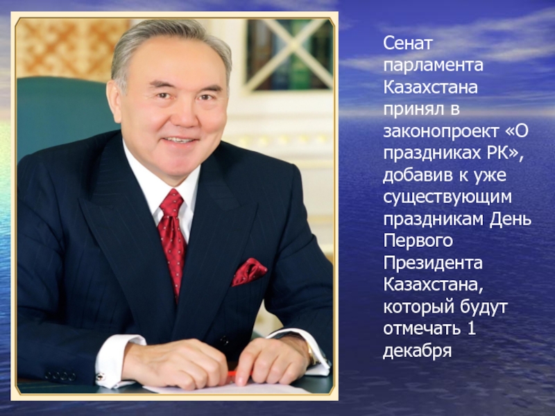 Сенат парламента Казахстана принял в законопроект «О праздниках РК», добавив к уже существующим праздникам День Первого Президента Казахстана, который будут отмечать 1 декабря