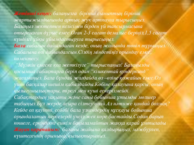 Слайд 9Жетінші кеңес: балаңызға бірінші сыныптың бірінші жартыжылдығында артық жүк артпауға тырысыңыз.