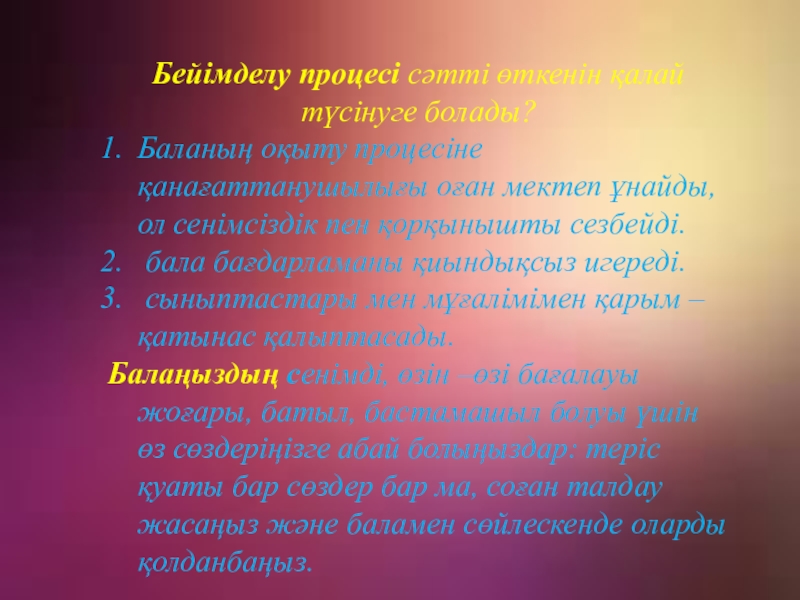 Слайд 13Бейімделу процесі сәтті өткенін қалай түсінуге болады?