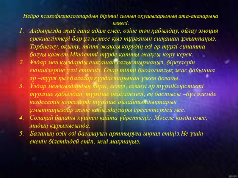 Слайд 16Нейро психофизиологтардың бірінші сынып оқушыларының ата-аналарына кеңесі.