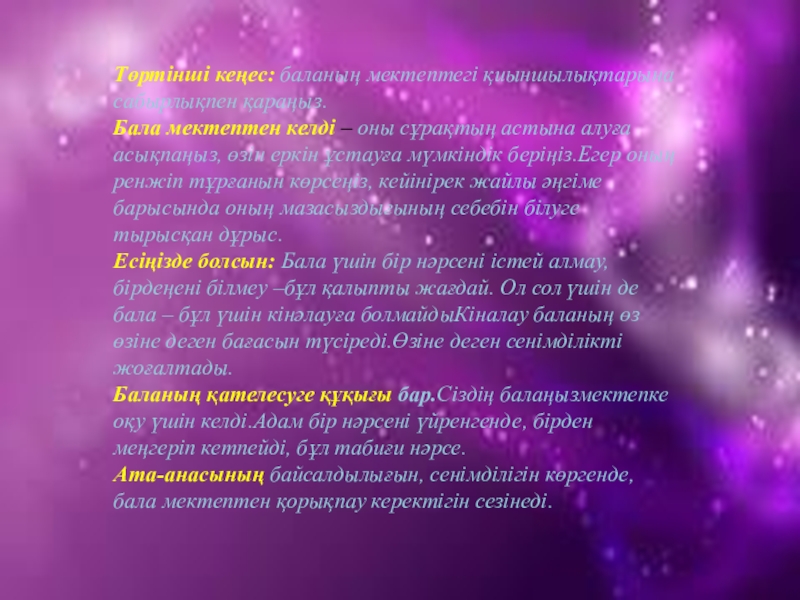 Слайд 6Төртінші кеңес: баланың мектептегі қиыншылықтарына сабырлықпен қараңыз.