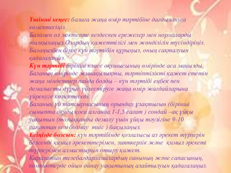 Баланың үй тапсырмасының орындау ұзақтығын (бірінші сыныпта оқуды қоса алғанда 1-1,5 сағат ) сондай –ақ ұйқы уақытын (толыққанды демалу үшін ұйқы тәулігіне 9-10 сағаттан кем болмау тиіс ) бақылаңыз.