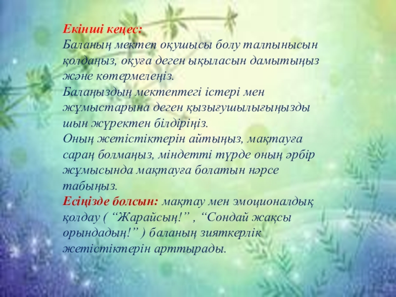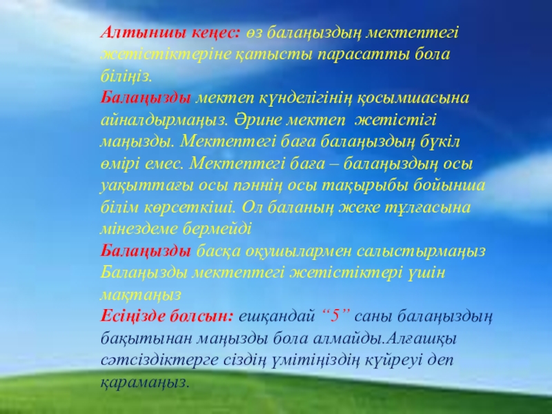 Слайд 8Алтыншы кеңес: өз балаңыздың мектептегі жетістіктеріне қатысты парасатты бола біліңіз.