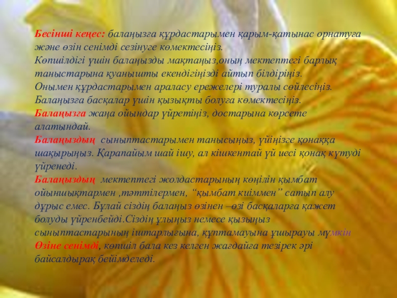 Слайд 7Бесінші кеңес: балаңызға құрдастарымен қарым-қатынас орнатуға және өзін сенімді сезінуге көмектесіңіз.