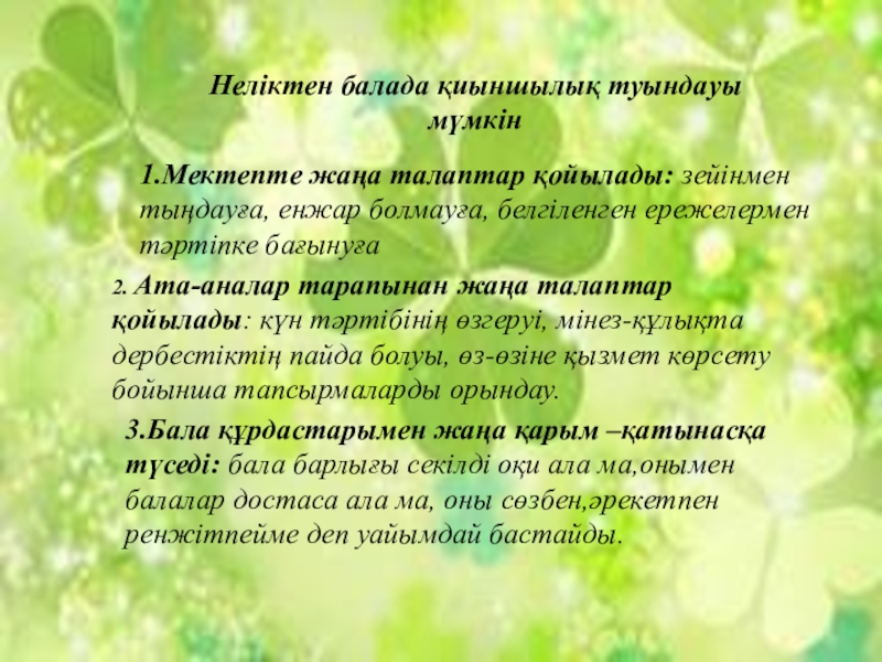 3.Бала құрдастарымен жаңа қарым –қатынасқа түседі: бала барлығы секілді оқи ала ма,онымен балалар достаса ала ма, оны сөзбен,әрекетпен ренжітпейме деп уайымдай бастайды.