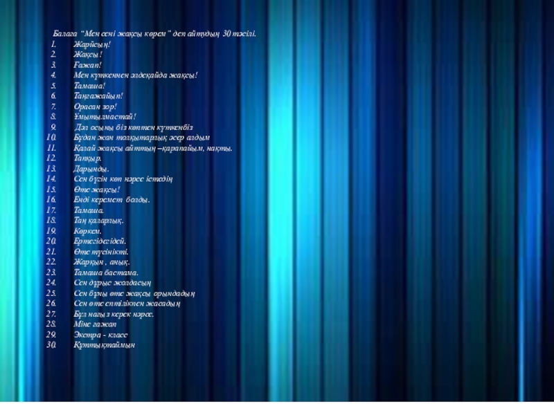 Слайд 15Балаға “Мен сені жақсы көрем” деп айтудың 30 тәсілі.