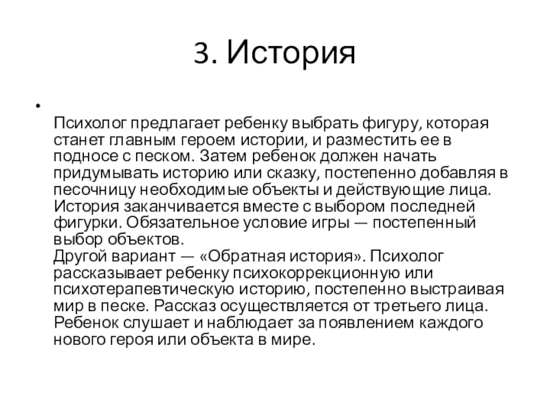 Другой вариант — «Обратная история». Психолог рассказывает ребенку психокоррекционную или психотерапевтическую историю, постепенно выстраивая мир в песке. Рассказ осуществляется от третьего лица. Ребенок слушает и наблюдает за появлением каждого нового героя или объекта в мире.