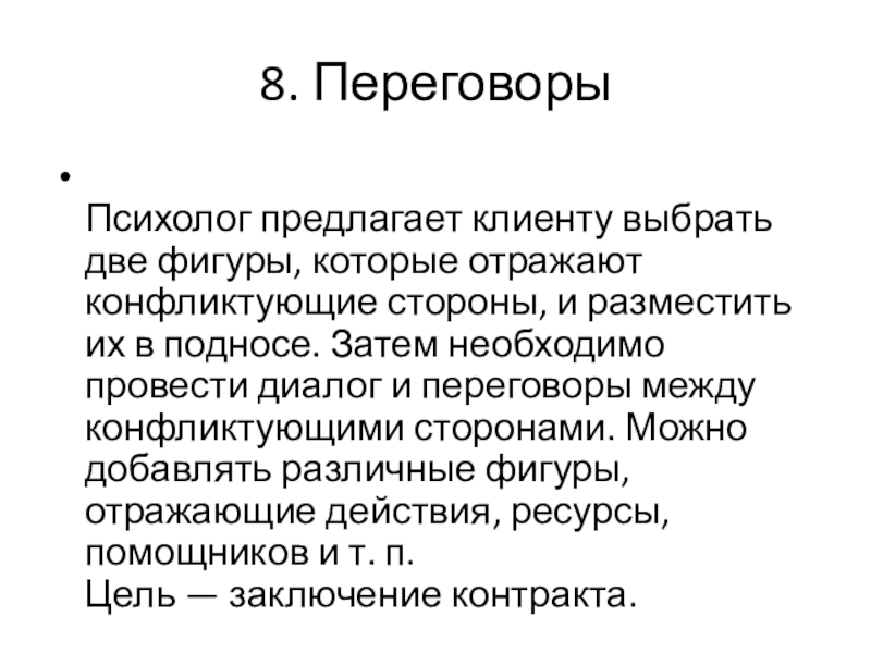 и разместить их в подносе. Затем необходимо провести диалог и переговоры между конфликтующими сторонами. Можно добавлять различные фигуры, отражающие действия, ресурсы, помощников и т. п.