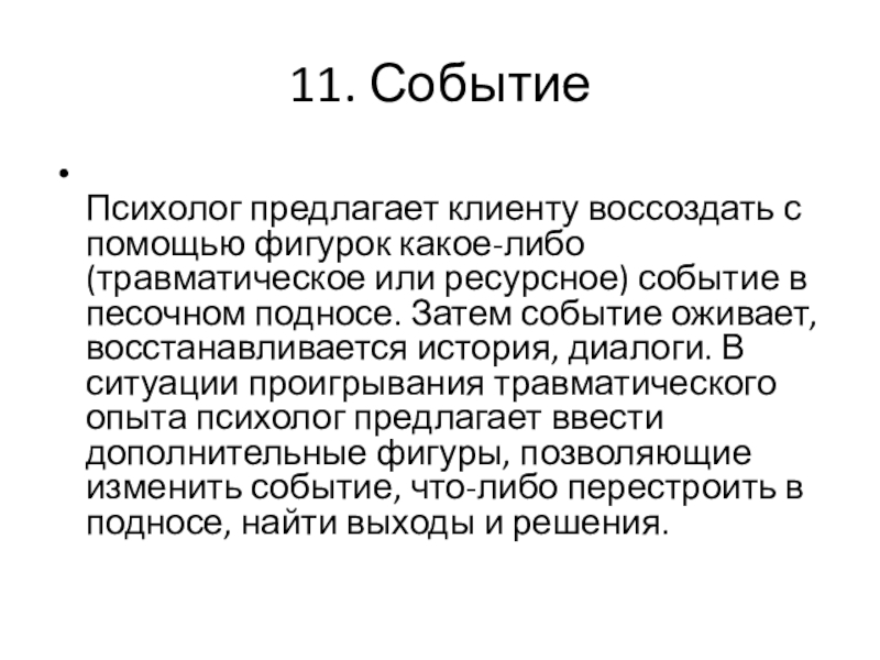ресурсное) событие в песочном подносе. Затем событие оживает, восстанавливается история, диалоги. В ситуации проигрывания травматического опыта психолог предлагает ввести дополнительные фигуры, позволяющие изменить событие, что-либо перестроить в подносе, найти выходы и решения.