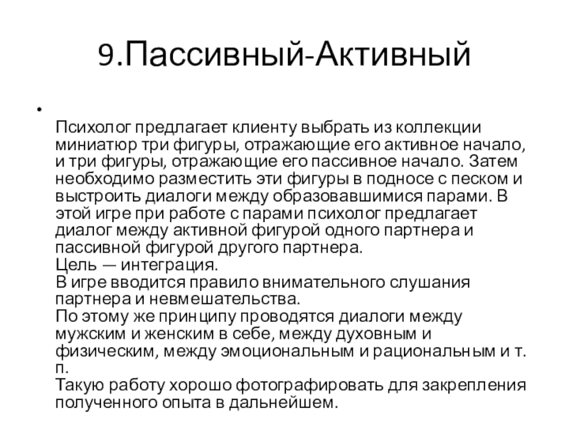 активное начало, и три фигуры, отражающие его пассивное начало. Затем необходимо разместить эти фигуры в подносе с песком и выстроить диалоги между образовавшимися парами. В этой игре при работе с парами психолог предлагает диалог между активной фигурой одного партнера и пассивной фигурой другого партнера.