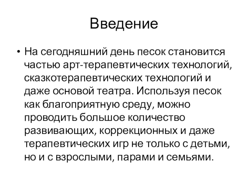 даже основой театра. Используя песок как благоприятную среду, можно проводить большое количество развивающих, коррекционных и даже терапевтических игр не только с детьми, но и с взрослыми, парами и семьями.