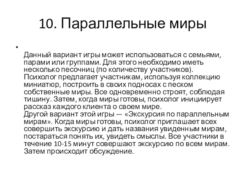 Другой вариант этой игры — «Экскурсия по параллельным мирам». Когда миры готовы, психолог приглашает всех совершить экскурсию и дать названия увиденным мирам, постараться понять их, увидеть смыслы. Все участники в течение 10-15 минут совершают экскурсию по всем мирам. Затем происходит обсуждение.