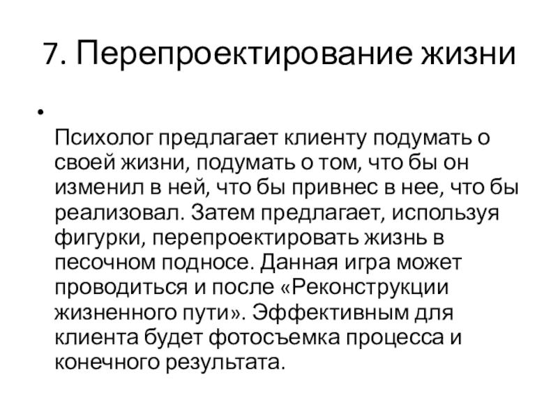 том, что бы он изменил в ней, что бы привнес в нее, что бы реализовал. Затем предлагает, используя фигурки, перепроектировать жизнь в песочном подносе. Данная игра может проводиться и после «Реконструкции жизненного пути». Эффективным для клиента будет фотосъемка процесса и конечного результата.