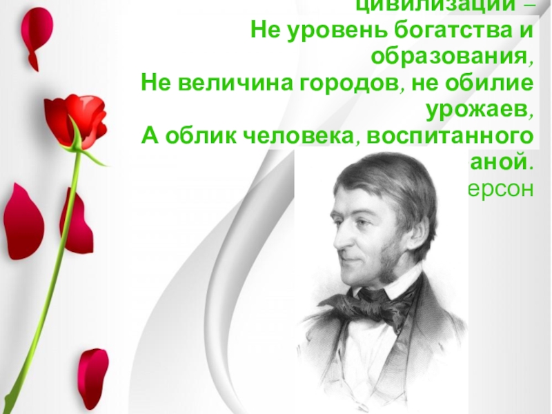Истинный показатель цивилизации – Не уровень богатства и образования, Не величина городов, не обилие урожаев, А облик человека, воспитанного страной. Р. Эмерсон