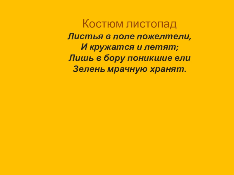 Костюм листопад Листья в поле пожелтели,  И кружатся и летят;  Лишь в бору поникшие ели