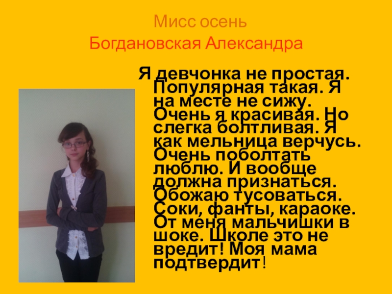 Мисс осень Богдановская Александра Я девчонка не простая. Популярная такая. Я на месте не сижу. Очень