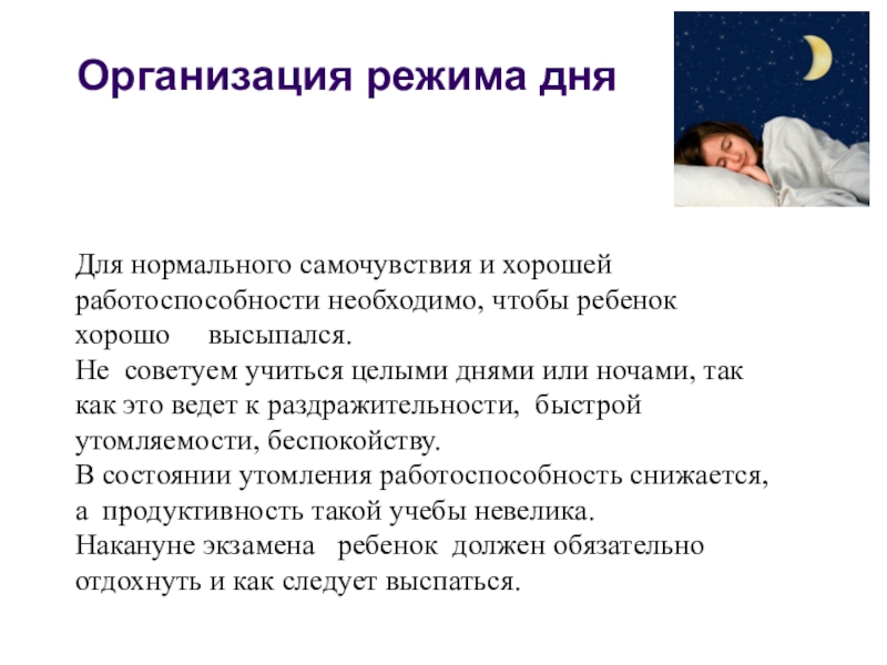 Накануне экзамена ребенок должен обязательно отдохнуть и как следует выспаться.
